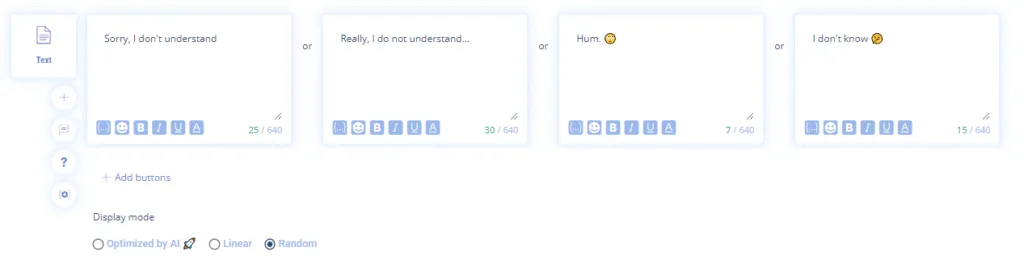 To improve the performance of a button you can use Botnation’s AB Testing features by pitting multiple BOMs against each other and/or changing the display order. You can then compare and optimize yourself or let the chatbot do it automatically with the option “Optimized by AI. This also works with carousels.