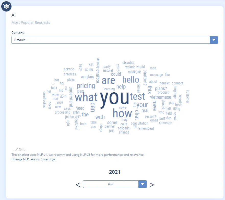 To know the most frequent requests made to your chatbot, Botnation offers a visual solution: the Word Cloud. By hovering your mouse over a word you will know how many times it has been used in the selected time period.