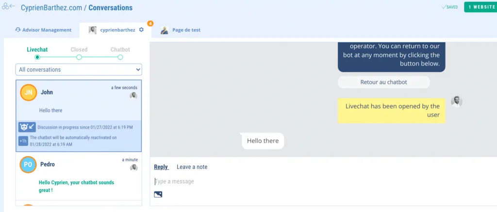 You can also see that the first green dot “Livechat” displays the live chat conversations. The second, “Closed”, will show you the closed conversations and the third, “Chatbot”, the automated chats of the chatbot allowing access to the history.