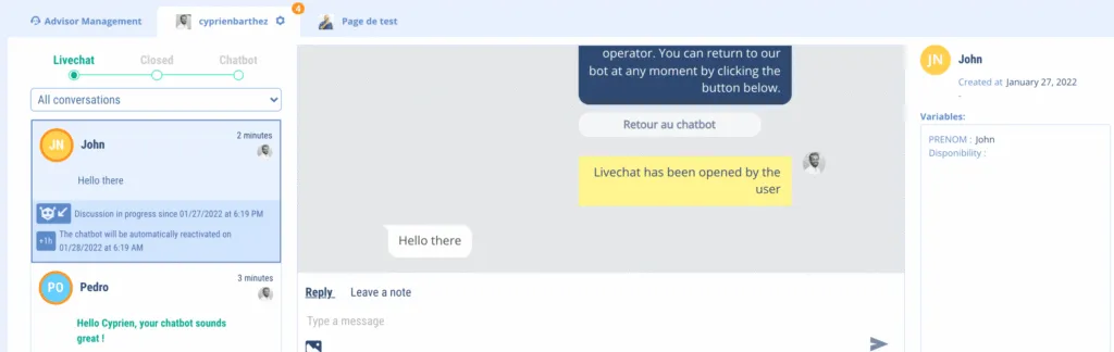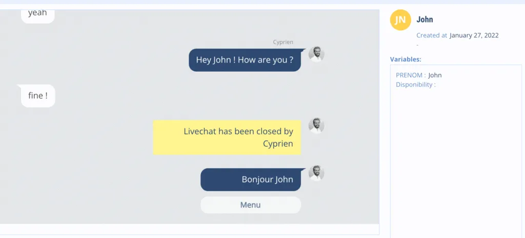 When configuring the chatbot, we advise you to ask for the user’s first name in the first sequences and to capture this information in a variable of type {{PRENOM}} or {{SOCIETE}}. This will allow you to display the first name of your contact person or the company name, which is a great advantage when you manage several tickets.