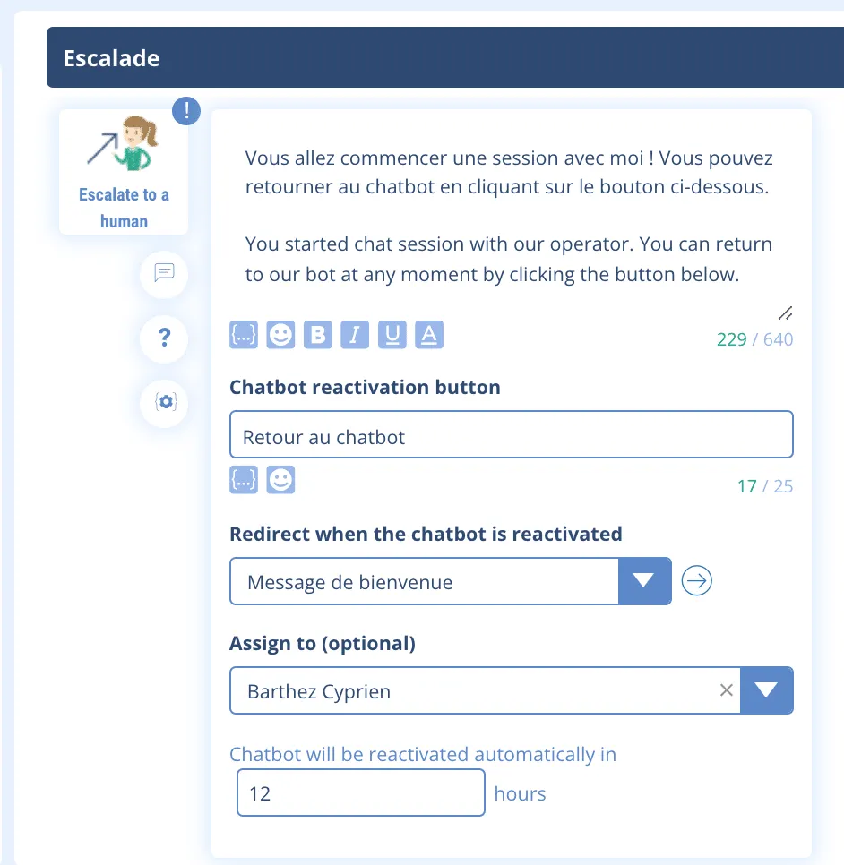 When the user wants to return to the chatbot, he will click on the button provided for this purpose (which you have previously configured in the escalation to the human). For example, this is the “Back to chatbot” button. Then, the chatbot’s sequences will unfold as you have programmed them.