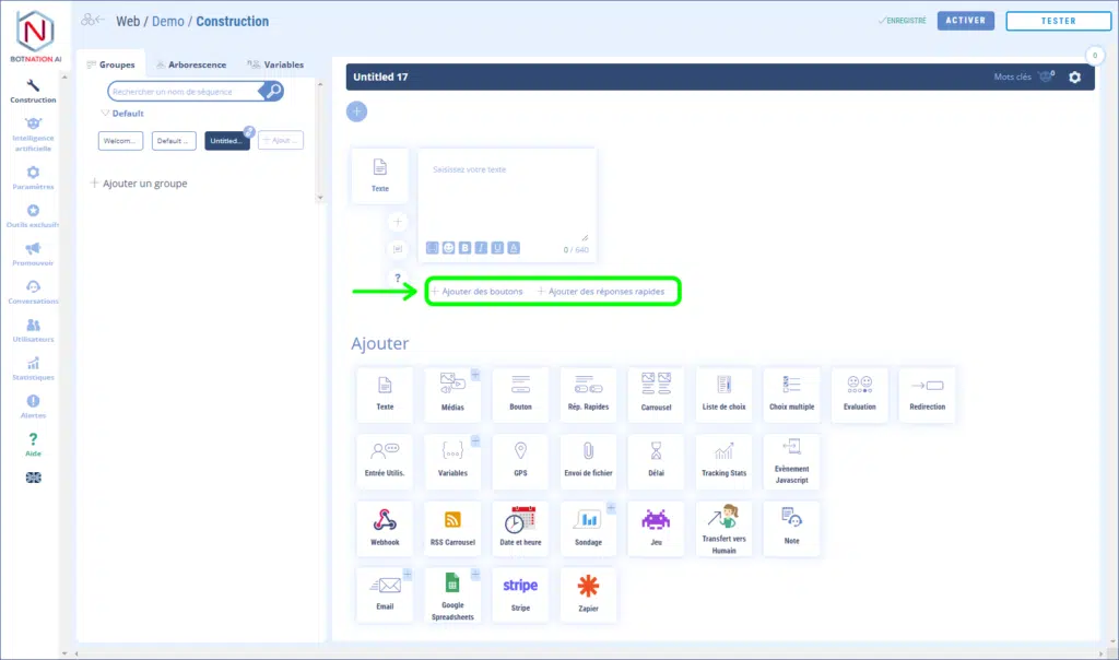 See the articles: Add buttons on Messenger, Add buttons on Web Chatbot, Add Quick Replies on Messenger and Add Quick Replies on Web Chatbot for more information.