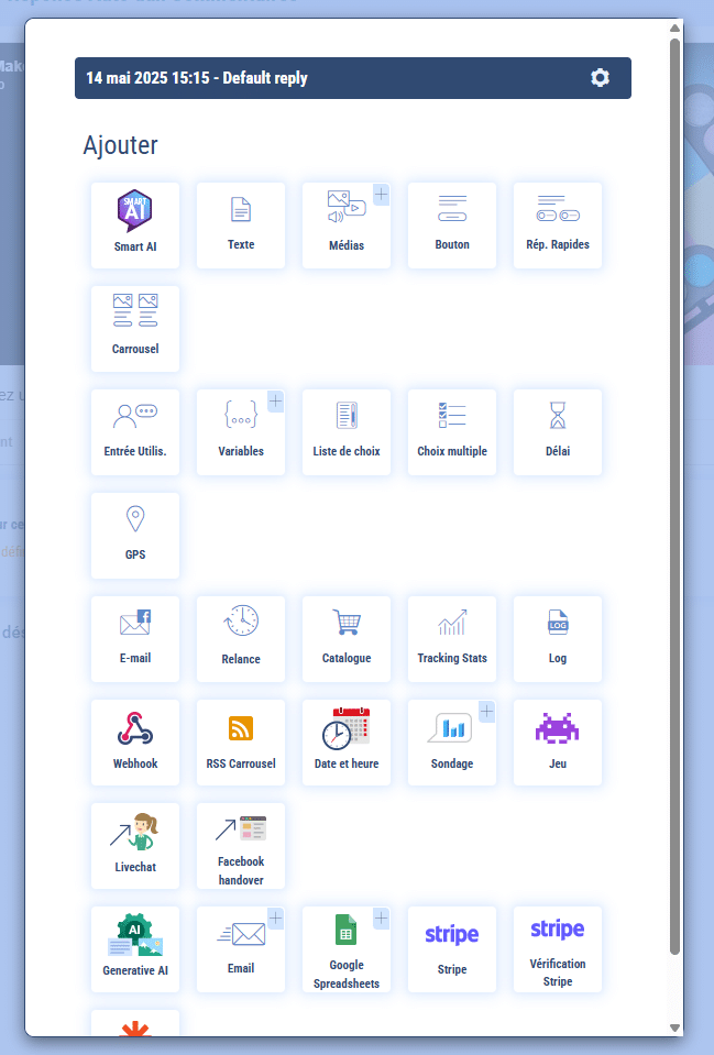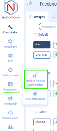 La fonction nommée “Réponse auto aux commentaires FB”, que vous trouverez dans votre espace de construction (voir capture d’écran), vous aidera à palier à ce problème :