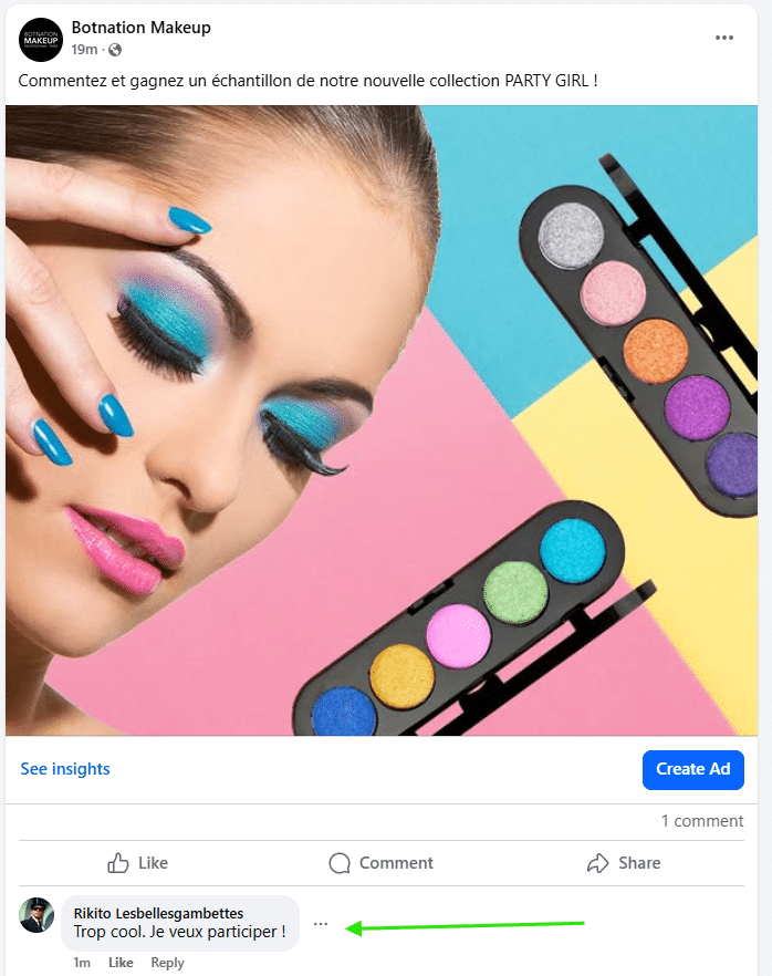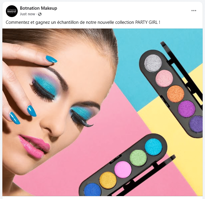 - La page Facebook Botnation Makeup a publié une photo avec un call to action (ici, un appel à commenter la publication) :