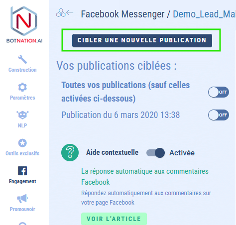 - Facebook limite les moyens d’entrer en contact avec votre audience, le chatbot se limite aux demandes entrantes. Ces moyens sont mentionnés dans l’onglet “Promouvoir”. A part les push notifications, vous avez peu de possibilités de communiquer directement avec vos usagers. La fonction détaillée ici permet de contourner cela ! D’ailleurs, nous avons fait un webinar sur le sujet.
