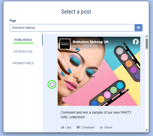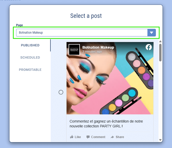 - Dans la catégorie “Published”, vous retrouverez les posts publiés précédemment. Il vous suffit de cliquer sur le bouton correspondant au post voulu. Ce sera la publication sur laquelle la séquence automatique s’activera en cas de commentaire !