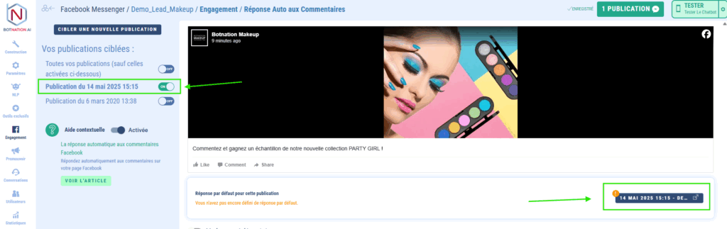 Une fois dans l’onglet dédié à la fonction, vous retrouvez donc les publications de votre page dans la colonne de gauche et la réponse par défaut à paramétrer sur la colonne de droite + le mode avancé.