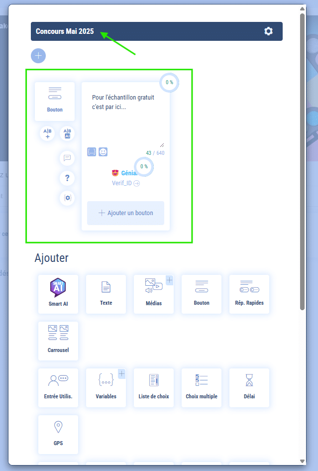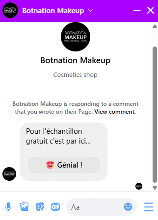 - En résumé, chaque fois qu’un utilisateur commentera la publication susmentionnée, quels que soient le.s mot.s employé.s, le chatbot ouvrira un dialogue privé et engagera la conversation par “Pour l’échantillon gratuit c’est par ici…”. Libre à l’utilisateur de cliquer sur le bouton et de converser avec le chatbot !
