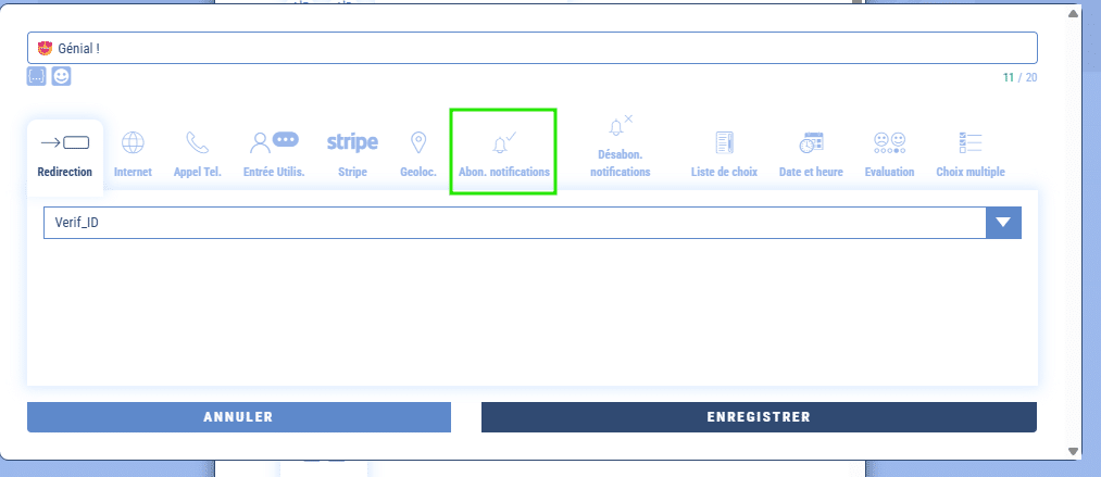 - Autre externalité positive : vous pouvez aussi collecter des optin via le bouton dédié pour ensuite envoyer un push à ces nouveaux adhérents à votre chatbot ! Cette option est présente sur tous les modules types boutons, réponses rapides… sous l’onglet “Abo. notifications” :