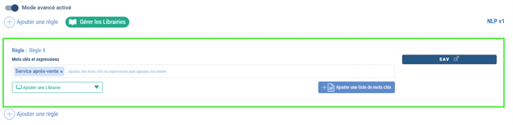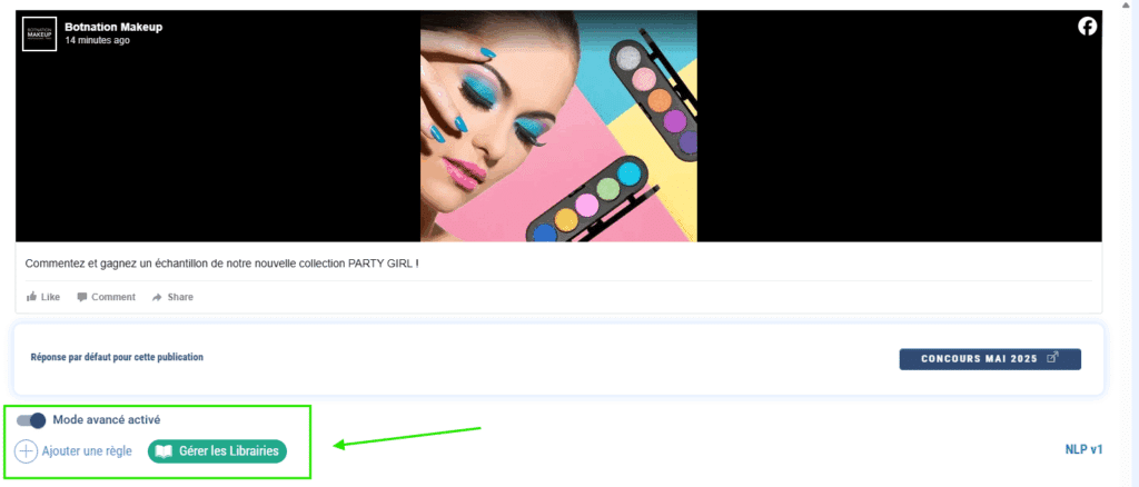 Un autre tableau de bord s’affiche. Celui-ci vous permet d’ajouter des règles d’intelligence artificielle (voir la documentation liée). Si vous choisissez d’ajouter l’expression “Service après-vente” alors chaque fois que “Service après-vente” sera tapé en commentaire de la publication, le chatbot se déclenchera sur la séquence indiquée. Cela s’appliquera à la publication en question, mais si vous ajoutez cette règle sur le mode par défaut, alors cela s’appliquera aux futurs commentaires de tous les posts.