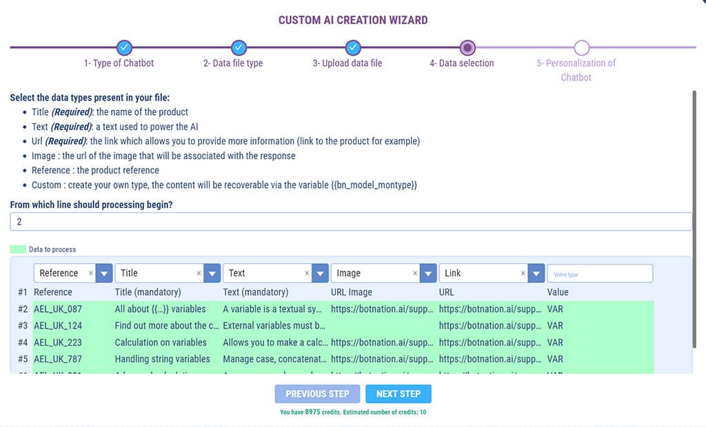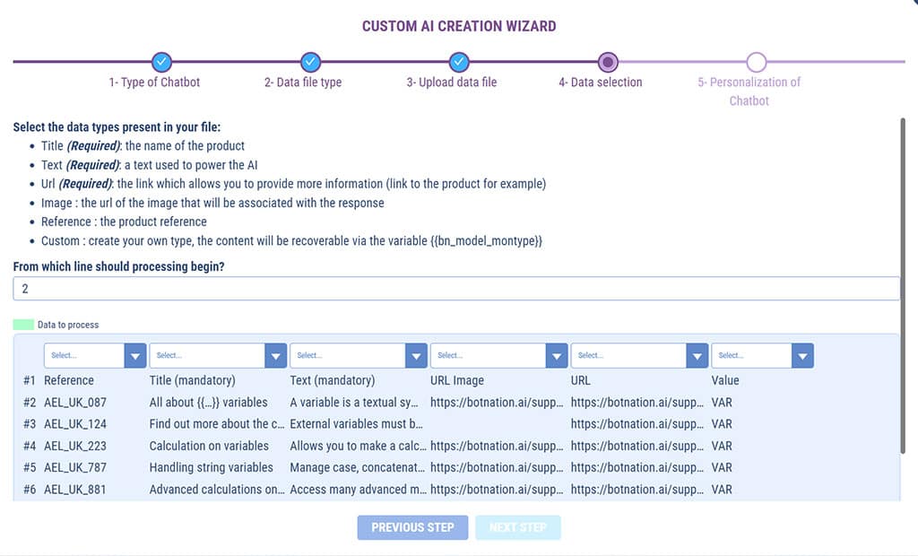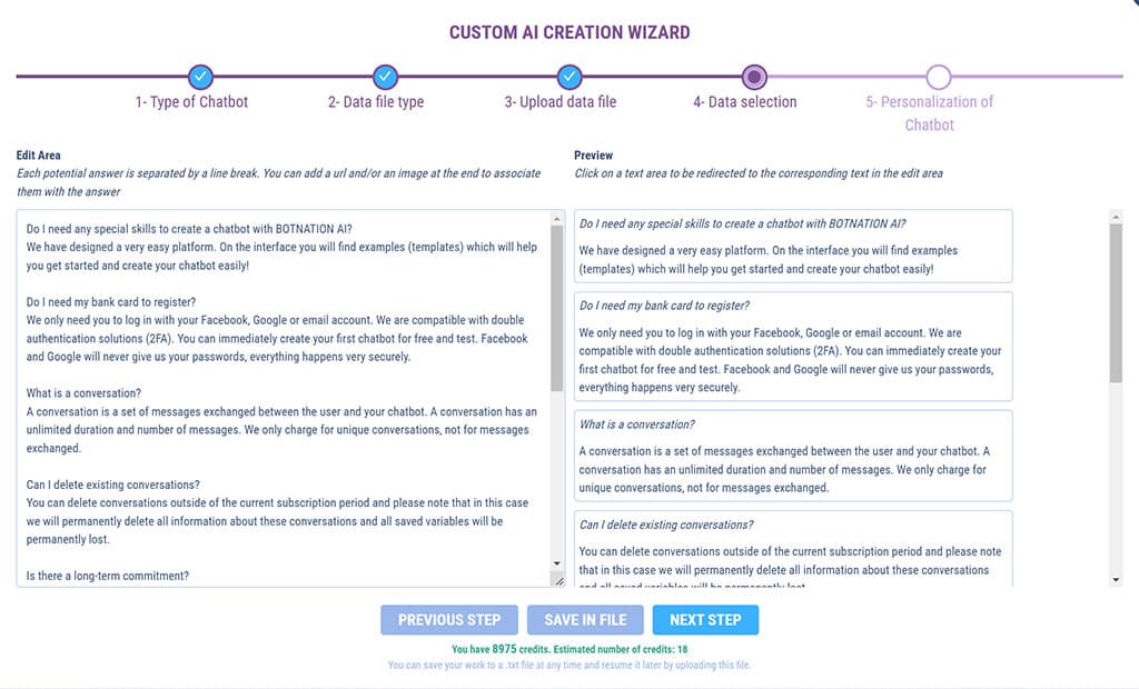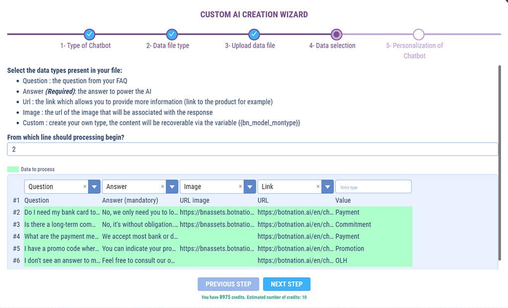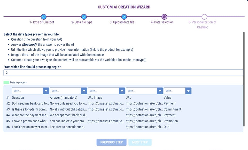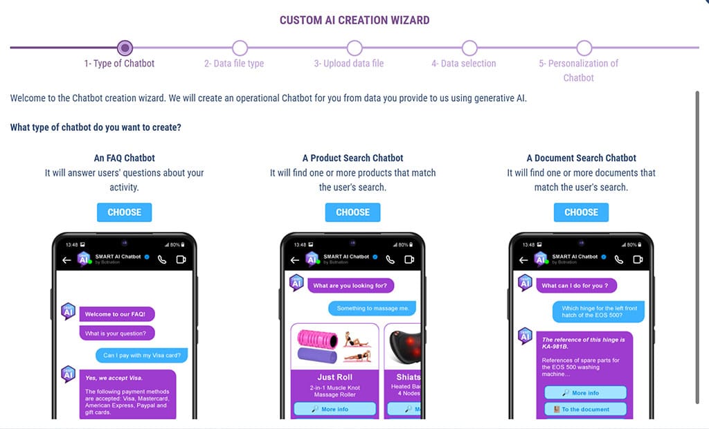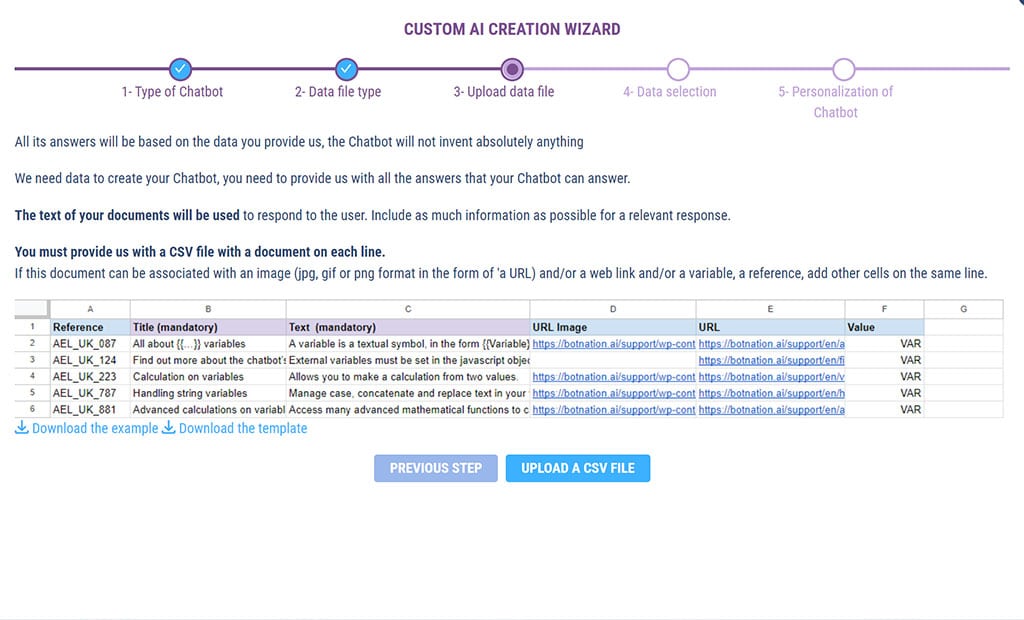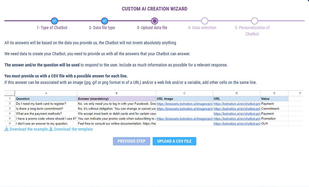 You’ll see how simple it is: just upload a simple CSV file and Botnation’s Smart AI takes care of everything. In just a few clicks, your chatbot will be able to respond to your users with the power of Generative AI’s natural language recognition on the unique basis of your data.