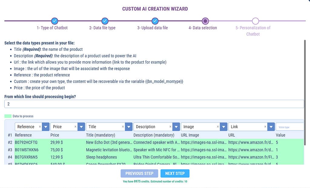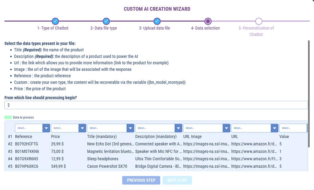 This is where you match the columns in your CSV file to the type of data to be processed by SMART AI.