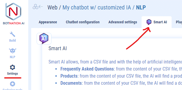 Open your chatbot in Botnation’s build interface and go to Settingsin theSMART AI tab.