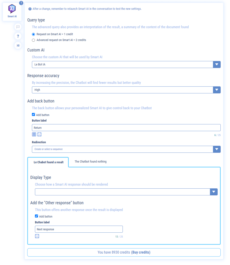Credits are required for the creation of the chatbot with SMART AI, but also for each addition to the database and each query made by users.