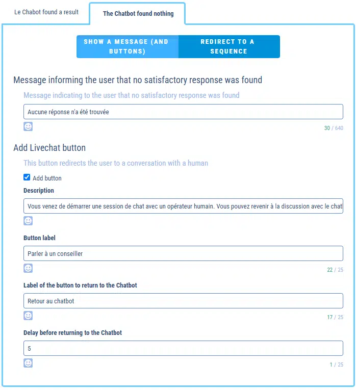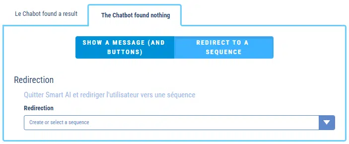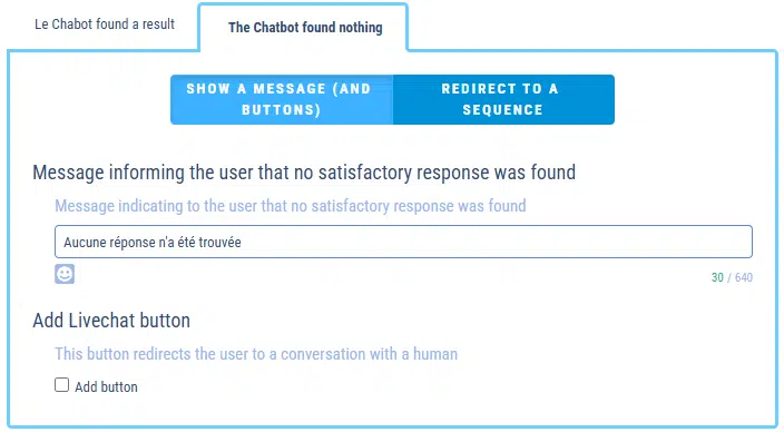In this case, the chatbot launches a sequence when it hasn’t found an answer. On this sequence, you are free to choose different behaviors.