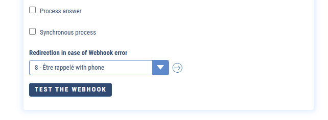When processing is synchronous, it is possible to select a redirection sequence in case of an error in your Webhook :