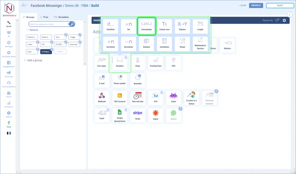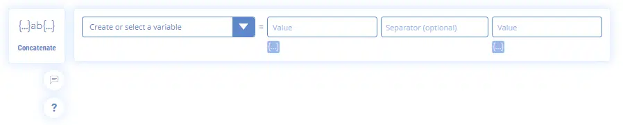 Among the construction features, click on “Variables” and then, in the menu that opens, click on “Concatenate”.