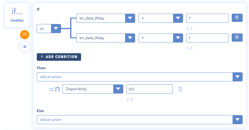 For the verification of the day we will use the variable {{bn_date_Wday}} which assigns a number from 1 to 7 to each day of the week (1 = Sunday, 2 = Monday… 7 = Saturday).