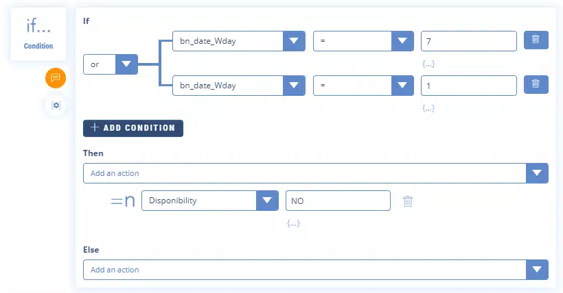 - If the variable “bn_date_hour” ≥12 AND If the variable “bn_date_hour” <14 Then the variable “Disponibility” will take the value “No”