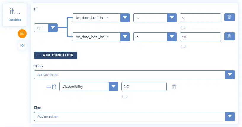 - If the variable “bn_date_hour” < 9 OR If the variable “bn_date_hour” ≥ 18 Then the variable “Disponibility” will take the value “No”