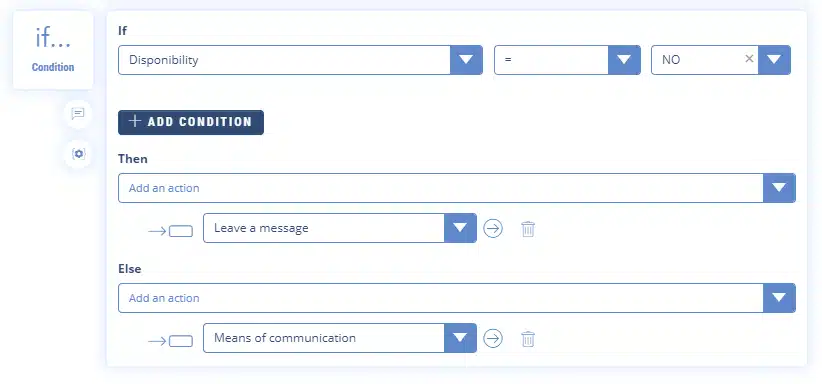 Finally, we use a condition on the “Availability” variable to guide the user according to the availability of a consultant: IF a consultant is not free (CAD when the “Availability” variable is set to “No”) THEN we redirect him to a sequence on which he can leave a message OR we redirect it to the climbing sequence.