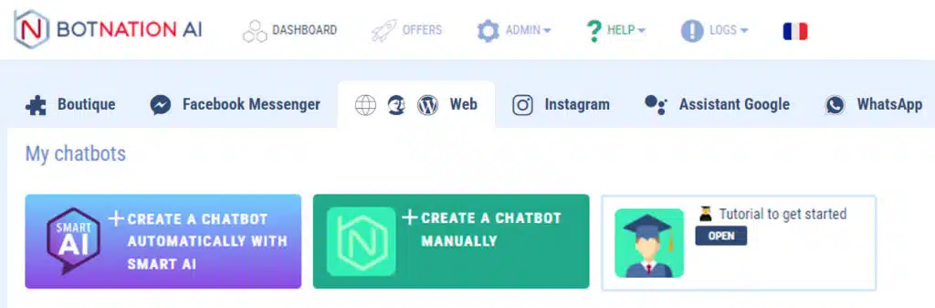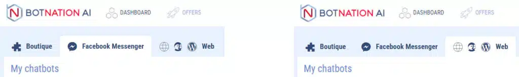 On your dashboard, choose which channel you want to create the chatbot on (Messenger or Chatbot-Web) by clicking on the corresponding tab.