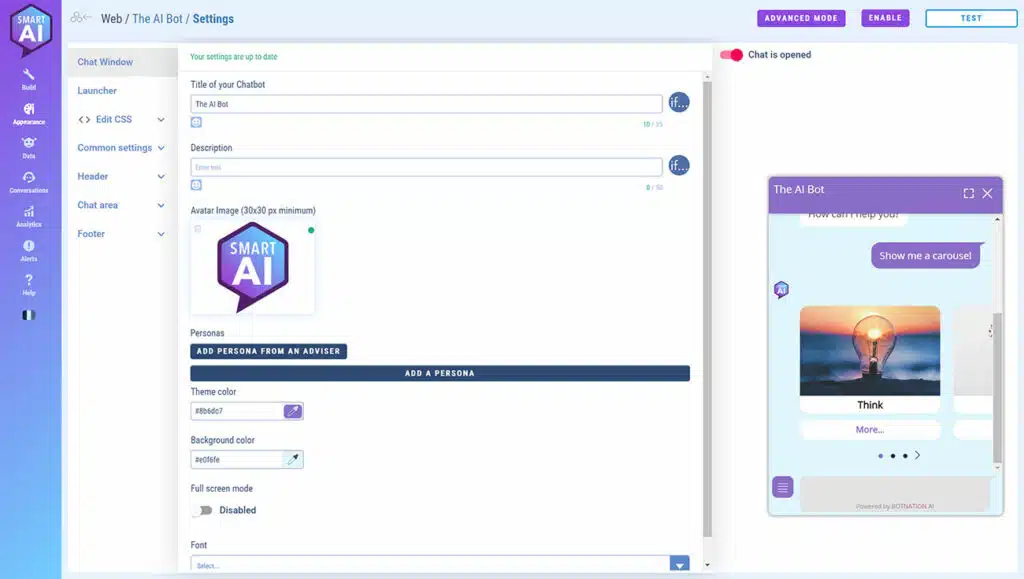 It’s on this screen that you’ll be able to customize your web chatbot graphically.