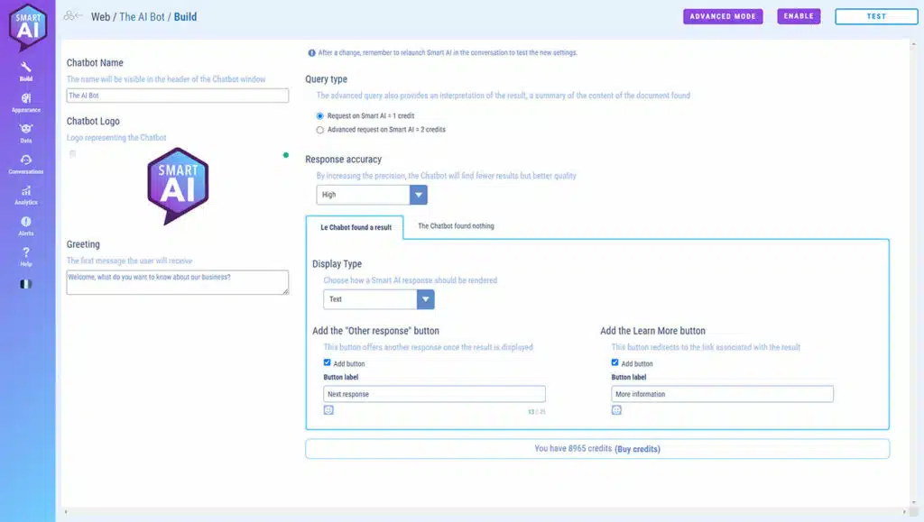 Credits are required for the creation of the chatbot with SMART AI, but also for each addition to the database and each query made by users.