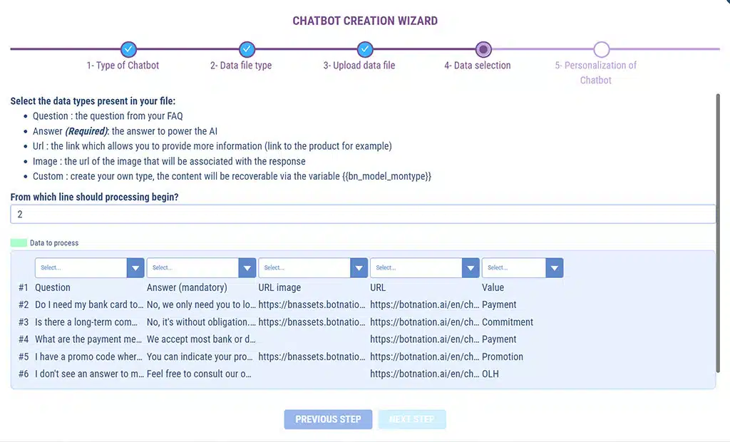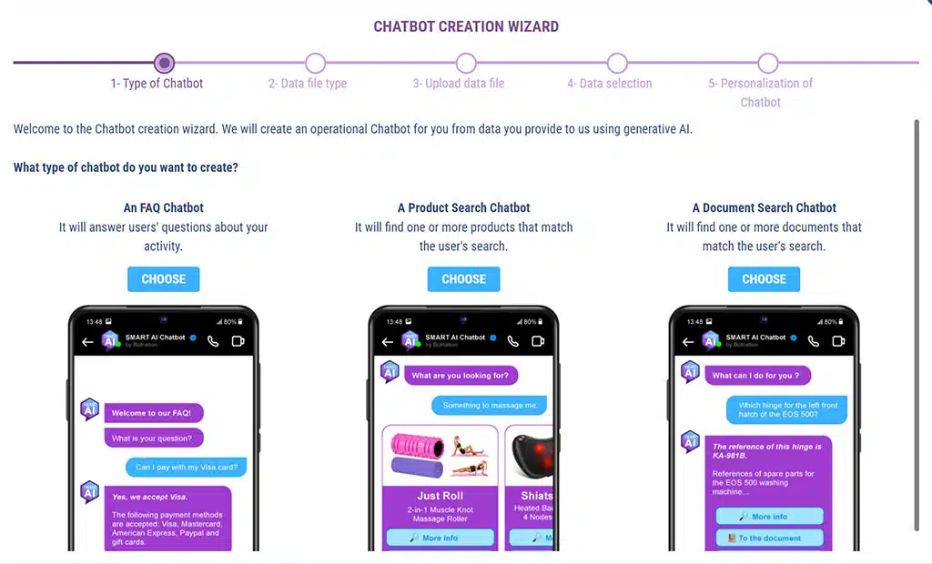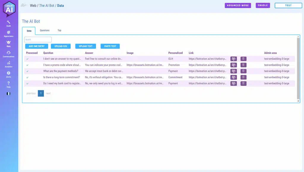 You’ll see how simple it is: just upload a simple TXT or CSV file and Botnation’s SMART AI takes care of everything. In just a few clicks, your chatbot will respond to your users with the power of Generative AI’s natural language recognition on the unique basis of your data.