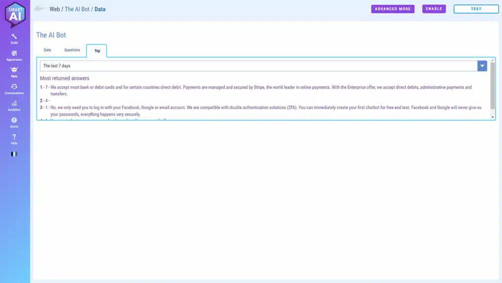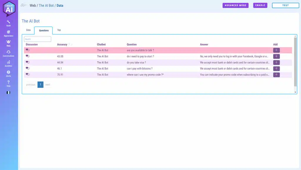 Questions that the chatbot was unable to answer appear here in red. At the end of the line, there’s an “Add” button. It’s handy for adding new answers to your AI.