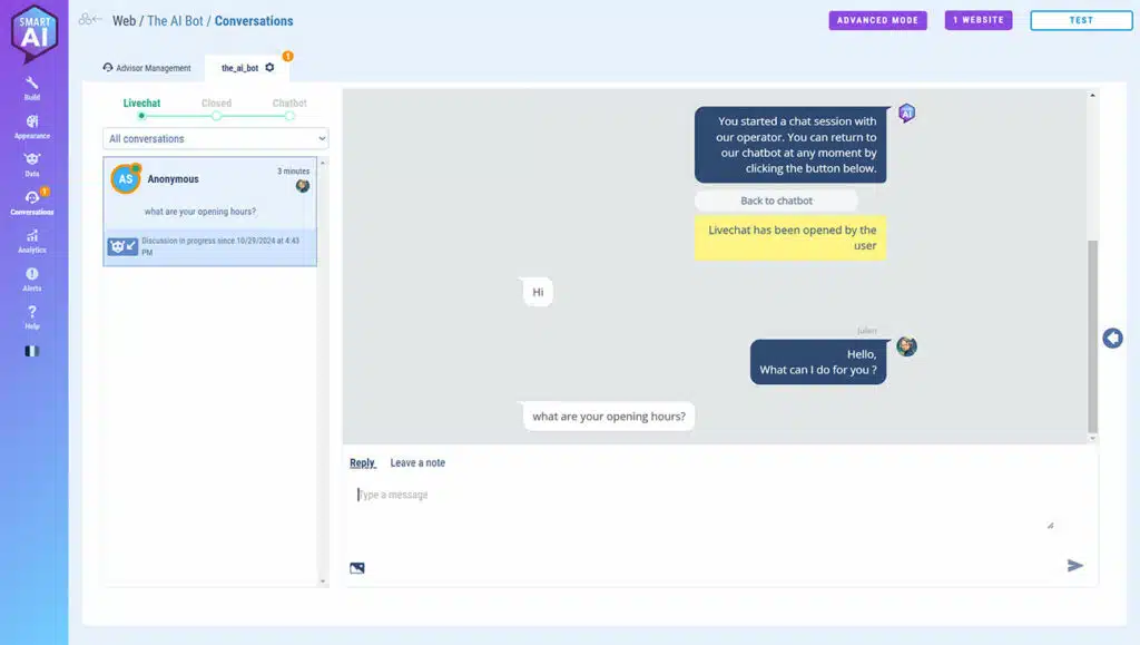 If Livechat has been enabled, in a web chatbot, this is where you’ll be able to manage discussions and your advisors.