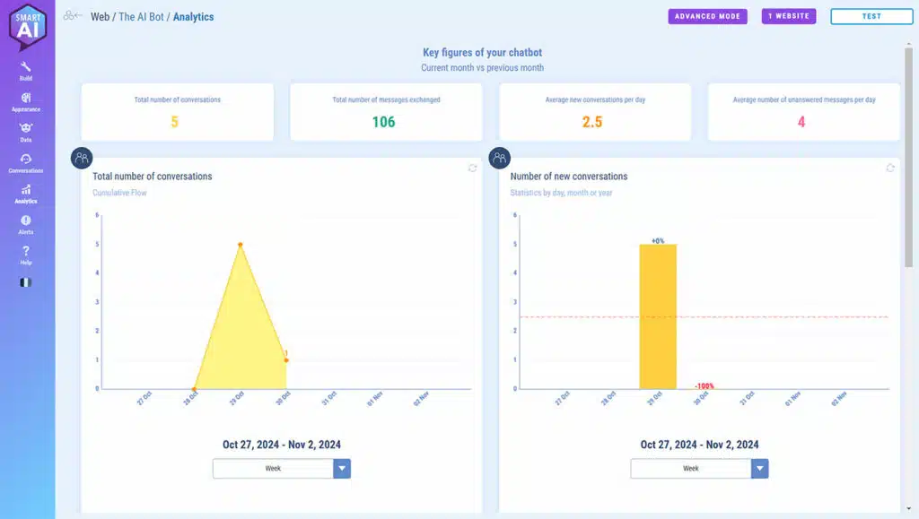 This screen shows your chatbot’s day-to-day statistics: number of conversations, number of messages exchanged, etc.