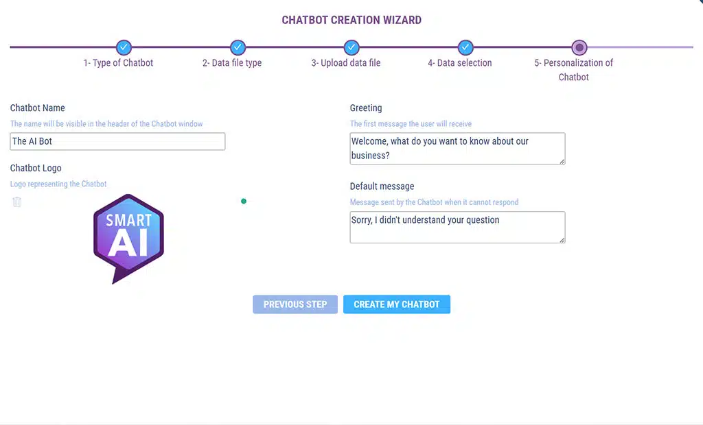 Finally, click on the ” CREATE MY CHATBOT ” button and the SMART AI magic begins.