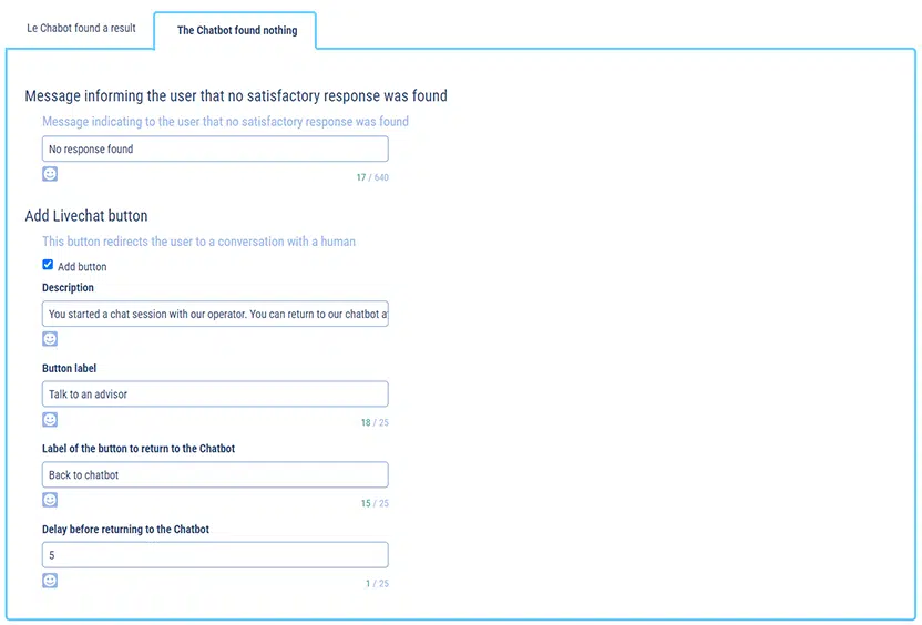 - Delay before returning to the chatbot = time in hours after which the chatbot will restart itself if the user or advisor has not closed the Livechat.