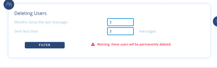 This way you can find very old users or those who are not really active. By clicking on the “Filter” button, the module will first show you the number of users corresponding to your request. You will then have to validate or not their deletion. This change will also be visible on your chatbot’s statistics.