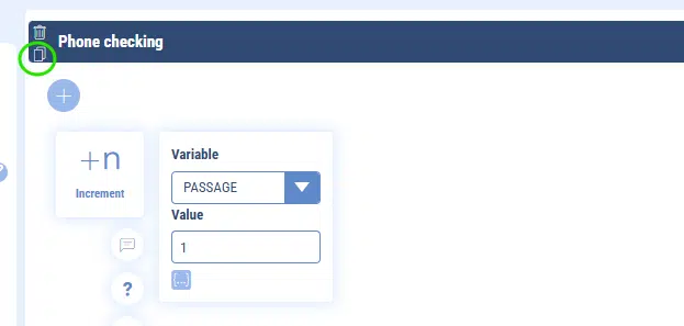 To duplicate a sequence in your chatbot to modify it or simply copy it to another group, simply click on the “copy” icon displayed in the header of your sequence.