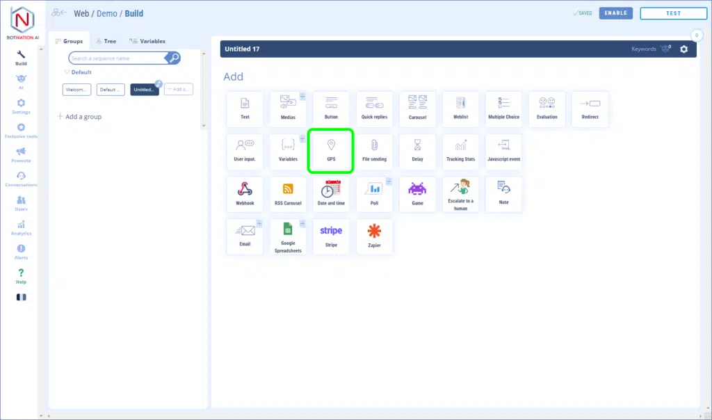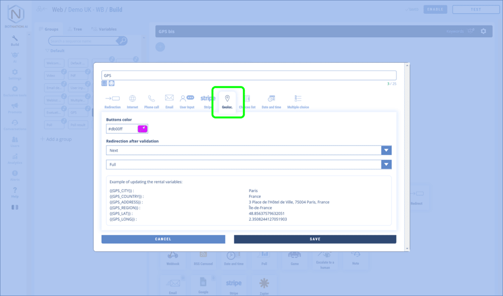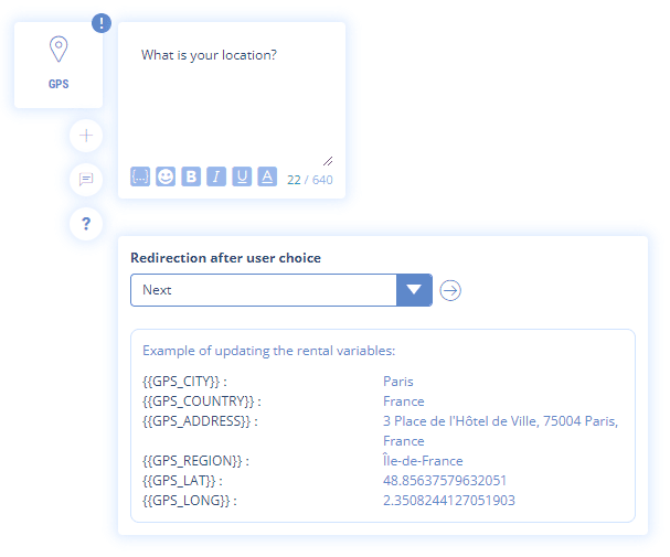 With your chatbot you may want to know where your users are so you can offer them services, restaurants, etc. near their location. It is possible to geolocate with precision the users of your chatbot with our GPS functionality.