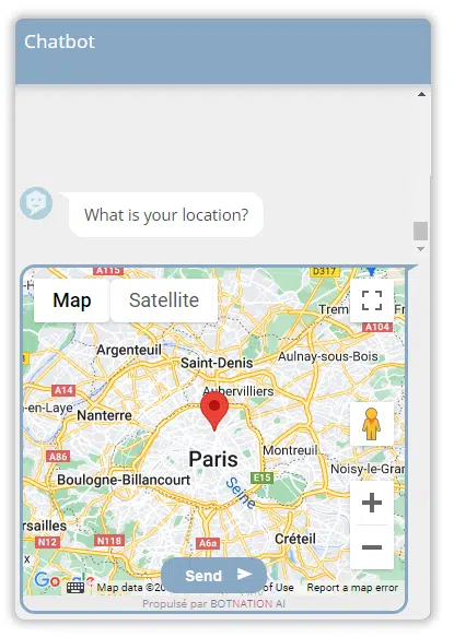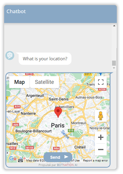A map will appear in the conversation stream. The user will be able to zoom in/out the map, move the marker and validate its position by clicking on the “Send” button.