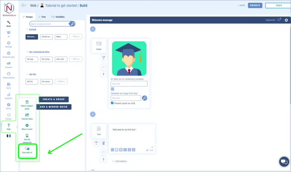 And when you are working on your chatbot, the “Help” tab is where it’s at.
