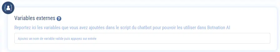 Il vous suffit ensuite de les déclarer dans votre Chatbot sous Paramètres > Paramètres avancés > Variables externes