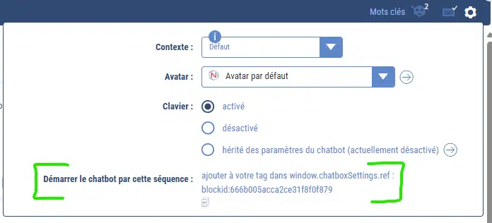 - ref : Permet de démarrer le chatbot sur une séquence particulière ou sur la séquence par défaut à chaque fois qu’un visiteur arrive sur une page de votre site. Pour démarrer sur la séquence par défaut, renseignez ce paramètre avec ‘restart’. Pour démarrer sur une séquence spécifique, renseignez la valeur indiquée dans les paramètres de la séquence (sur l’interface de votre bot)
