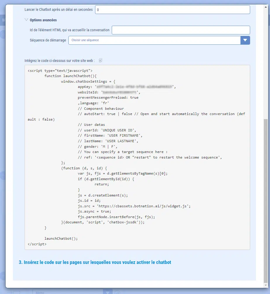 - appKey (obligatoire) : Ne pas modifier la valeur qui est fixée dans le code à intégrer.
