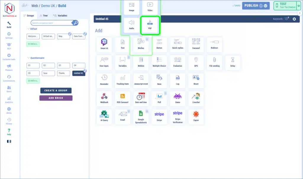 Just as it is possible to add an image or a video in a sequence of your chatbot, you can also add a PDF file to, for example, propose the download in PDF format of a price list, a product instruction manual, a contract, general conditions etc…