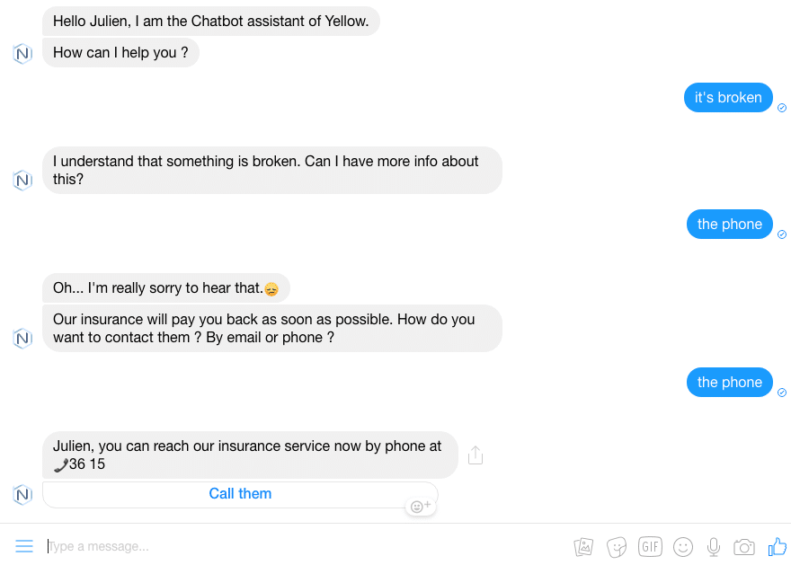 If we don’t use Contexts, this conversation is not really feasible because the expression “the phone” cannot trigger 2 different sequences – the first one analyzing the broken object, the second one proposing a connection – except by juggling with conditions/incrementations and a result that could sometimes be random.