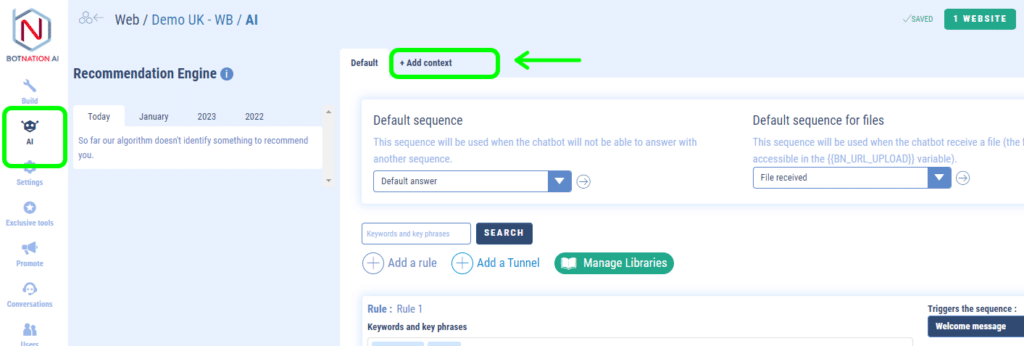 In the “AI” menu a tab bar is available where you can define contexts.