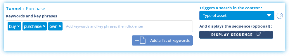 We create a first Tunnel “Purchase” with the keywords corresponding to this intention and which will launch a search in the Context “Type of asset”.