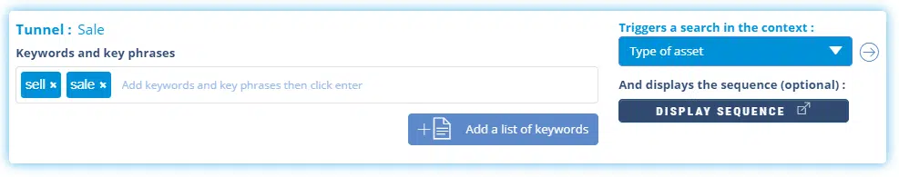 We then create a “Sale” Tunnel with the corresponding keywords and which will also launch a search in the “Type of asset” Context.