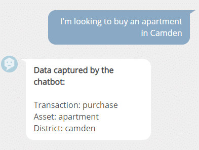 So if the user writes “I’m looking to buy an apartment in Camden” the chatbot will detect the intentions and translate them as follows: