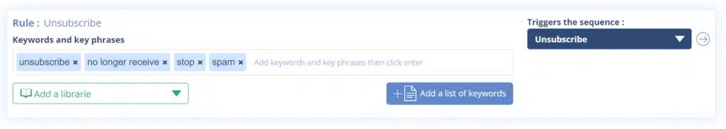 1 – Create an “AI” rule with the words “unsubscribe”, “no longer receive”, “stop”, “spam” and associate them to a sequence that you can call “unsubscribe”.