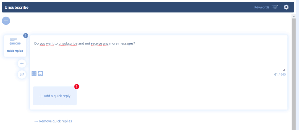 2 – In this “unsubscribe” sequence, all you have to do then isuse a “quick answers” element and formulate a question like: “do you want to unsubscribe and not receive any more messages?”